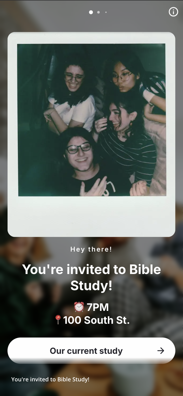 Hey [Name], I had such a great time at the concert with you! 🎶 I’d also love to invite you to Bible study—it’s a smaller group where we hang out, talk about life, and dig into Scripture together. Here’s the invite with the details: [link]